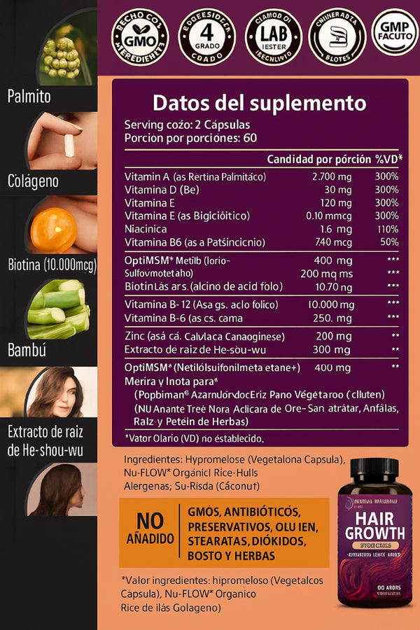 Biotina (10 000 mcg) Colágeno hidrolizadoOptiMSM® (metilsulfonilmetano)Saw PalmettoVitaminas del complejo B (B1, B2, B3, B5, B6, B7, B9, B12)
